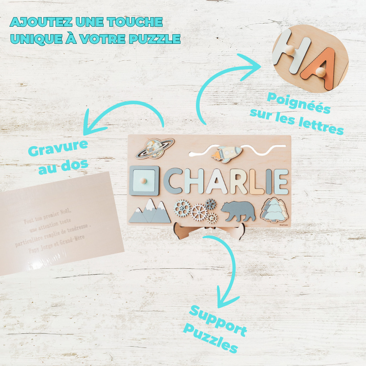 Transformez le jeu en apprentissage avec ce puzzle en bois sur mesure, idéal pour aider votre enfant à reconnaître son nom tout en développant des compétences essentielles et en s'amusant.